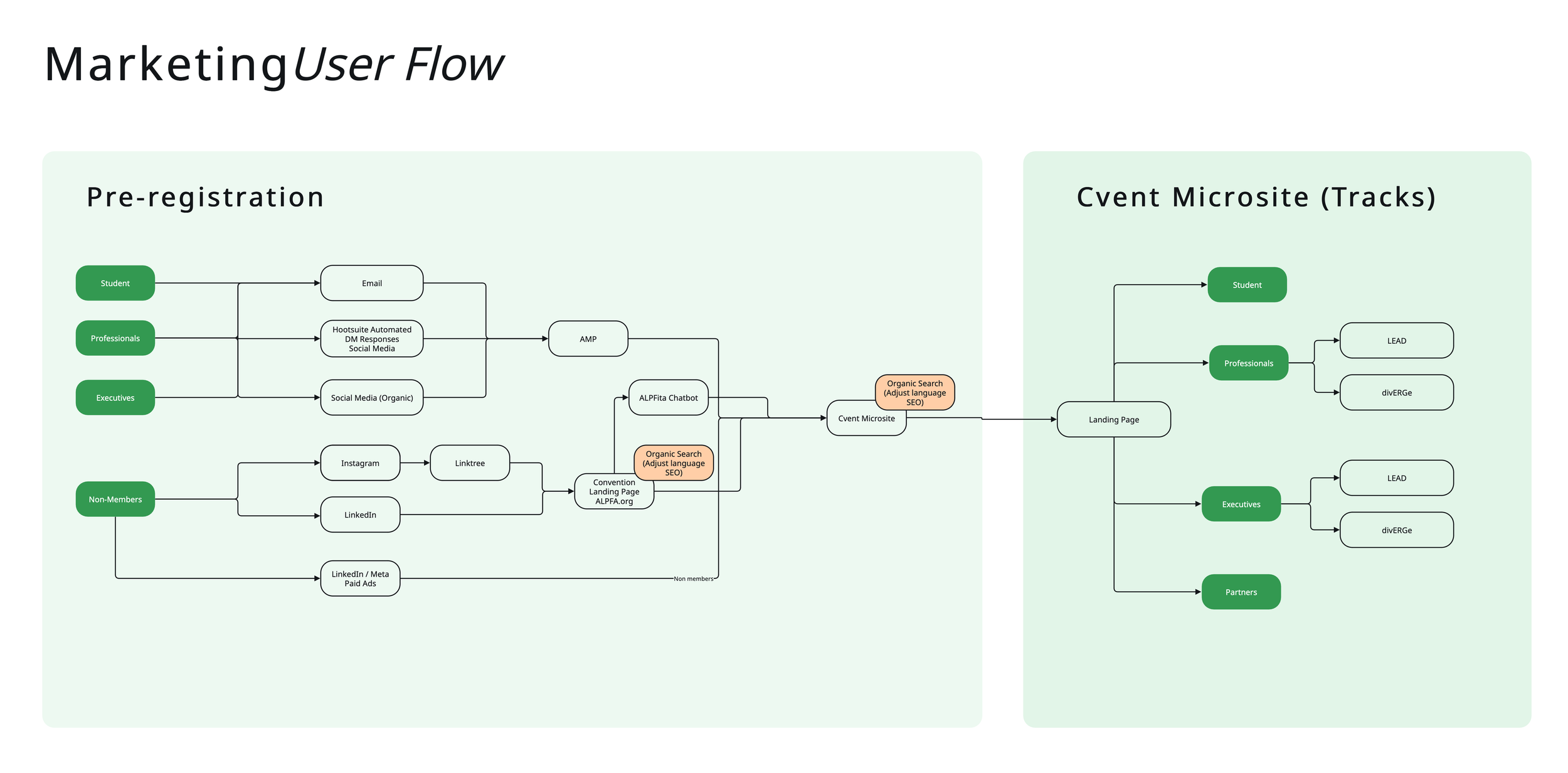 Each pathway was constructed to align with audience-specific behaviors and information needs, incorporating both organic and paid traffic sources through platforms like LinkedIn and Instagram. The event microsite serves as the central conversion point, featuring track-specific content that guides users to appropriate lead-generation opportunities.